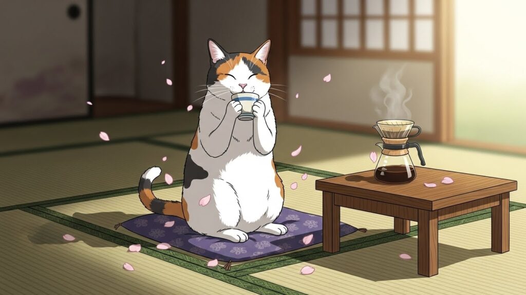 🌟 プロンプト例: 「桜吹雪の中、畳の上で優雅にコーヒーを飲む猫のイラスト。和風モダン、高解像度、優しい光」
